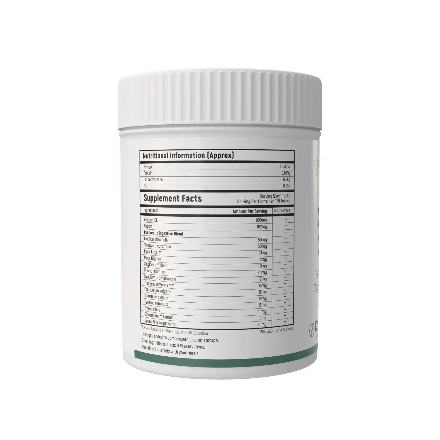 The combination of betaine HCL, pepsin, gentian bitters, and digestive enzymes supports the breakdown of food, aids in protein digestion, and helps optimize the absorption of nutrients, thereby alleviating digestive discomfort.