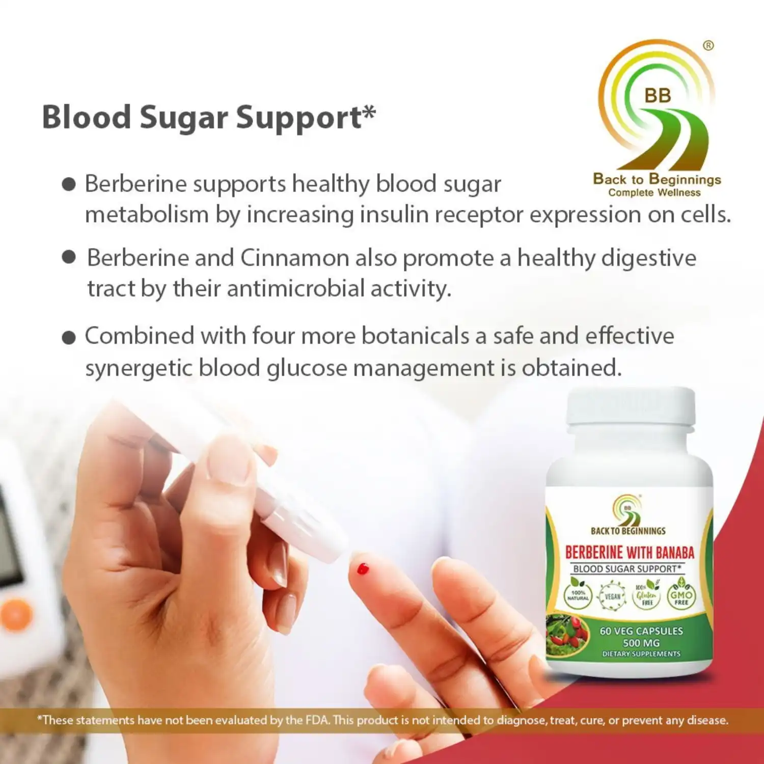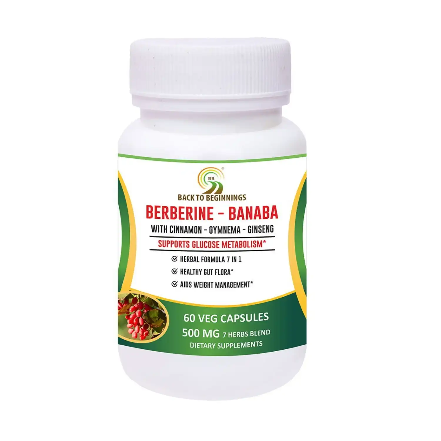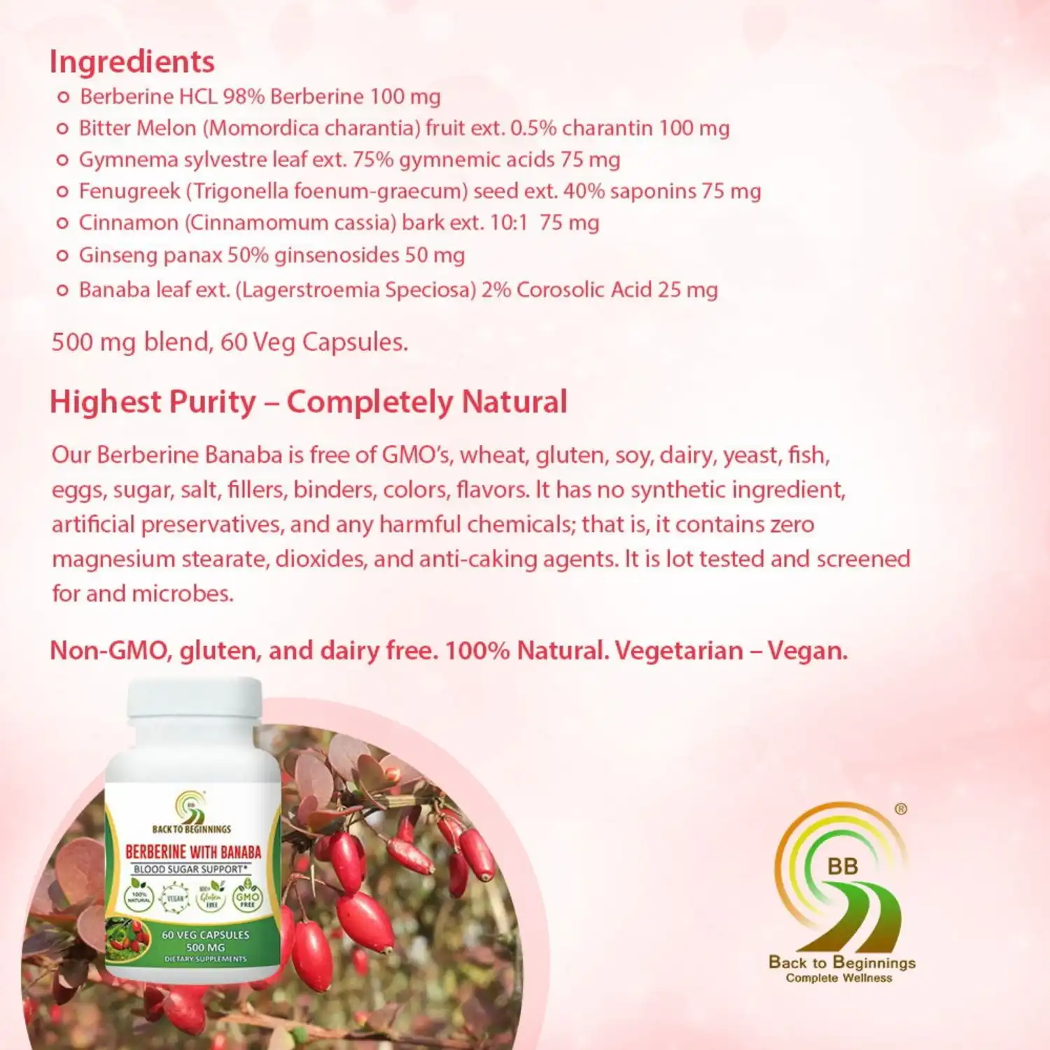 BB Back to Beginnings Complete Wellness Berberine – Banaba With Cinnamon, Gymnema & Ginseng 500 Mg Blend, For Blood Sugar Management, Weight Loss, 1 Pack of 60 Veg Caps