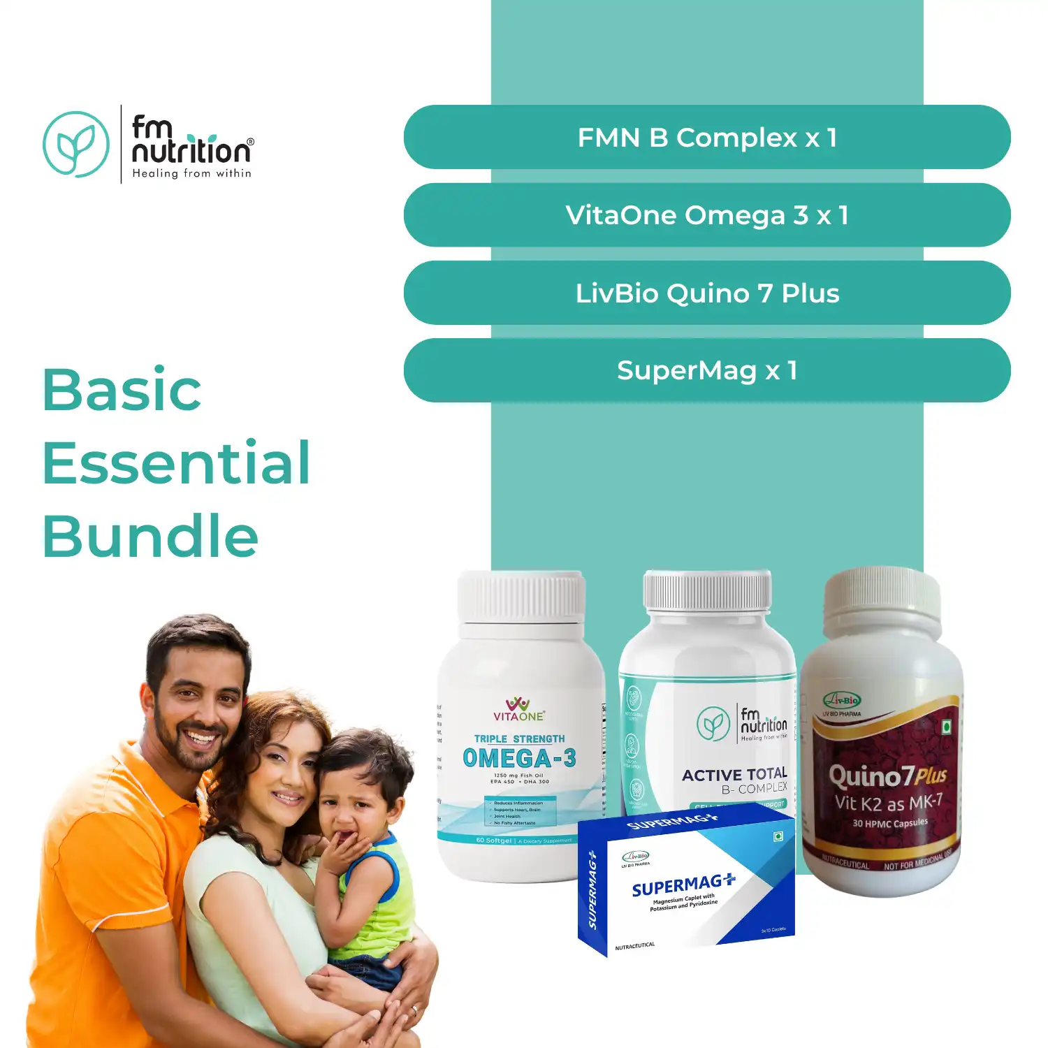 The Basic Essentials Bundle brings together four daily supplements to support energy, immunity, heart health, and overall wellness. The combination of FMN Active total Vit B Complex, Vitaone Omega 3, Livbio Supermag and Livbio Vit D3 make it a complete foundation for everyday vitality.