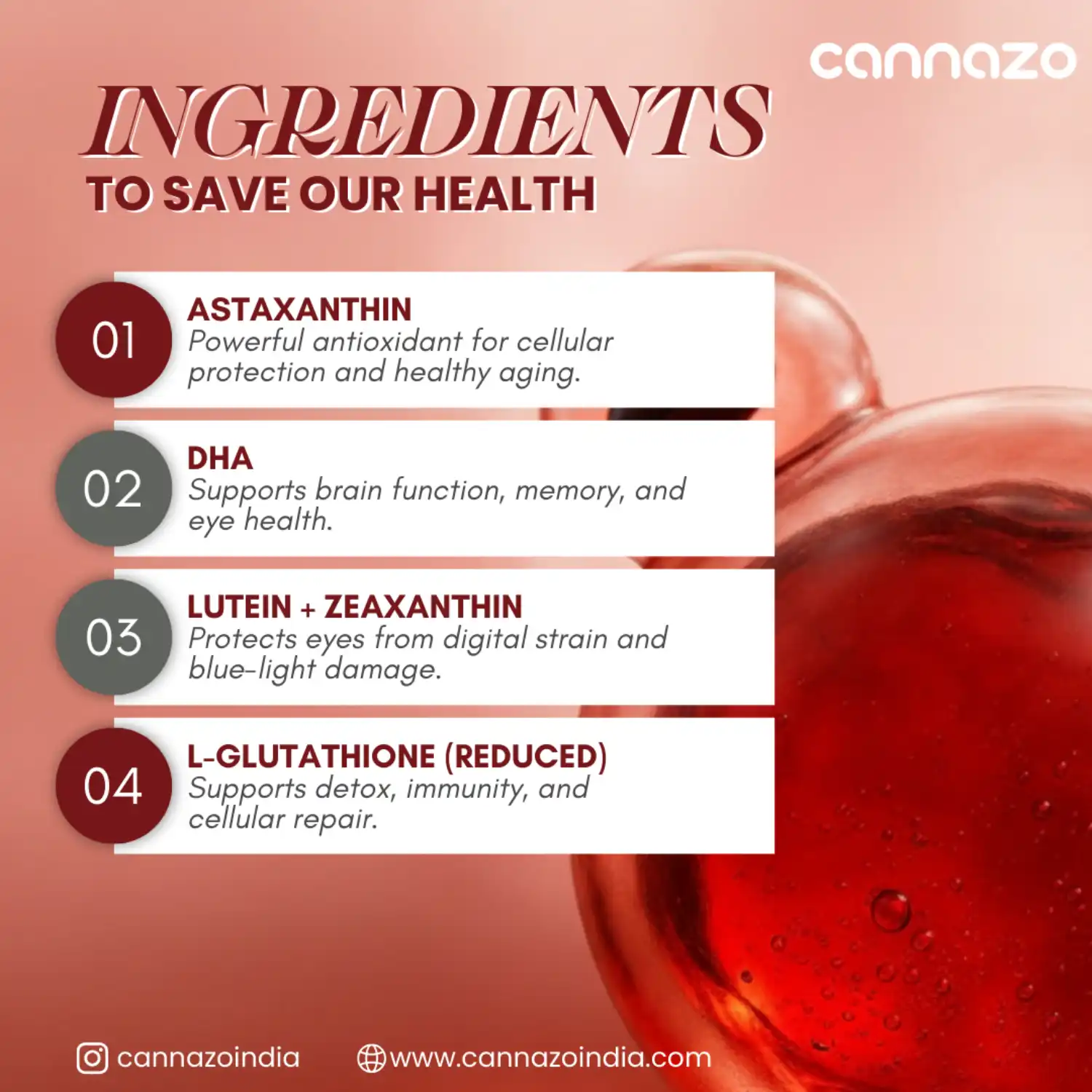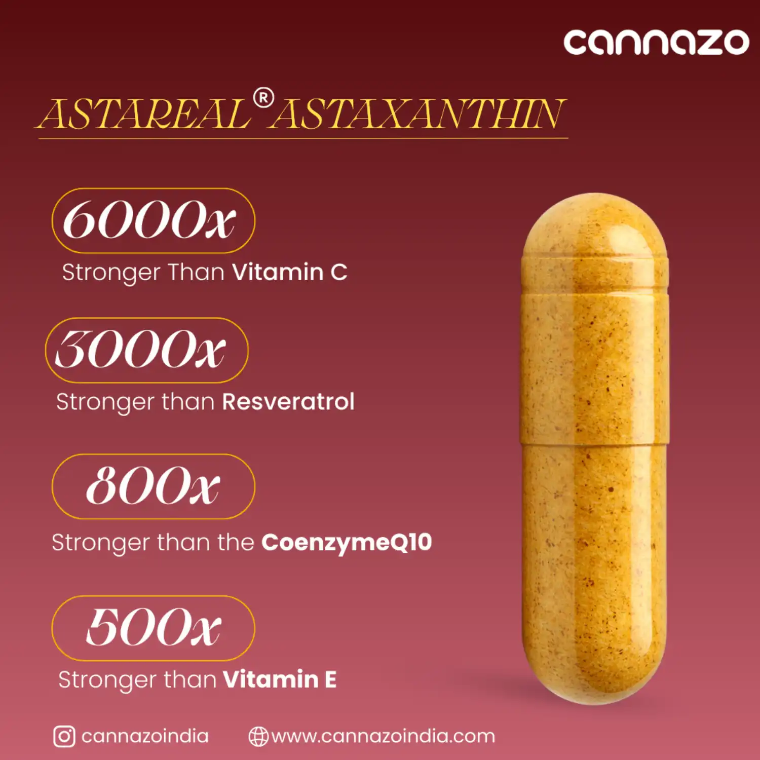Cannazo India’s AstaZen® is a next-generation antioxidant formulation combining AstaReal® Astaxanthin from Japan with DHA, lutein-zeaxanthin, and L-Glutathione to provide comprehensive support for cellular protection, eye health, cognitive function, and healthy aging with radiant skin.