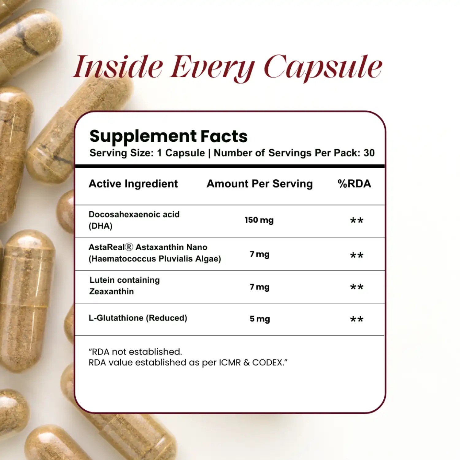 One of the most potent naturally occurring antioxidants known, capable of crossing both the blood–brain barrier and blood–retinal barrier. Supports cellular integrity, healthy aging and protection. - DHA (Docosahexaenoic Acid) (150 mg): Essential Brain Nutrient