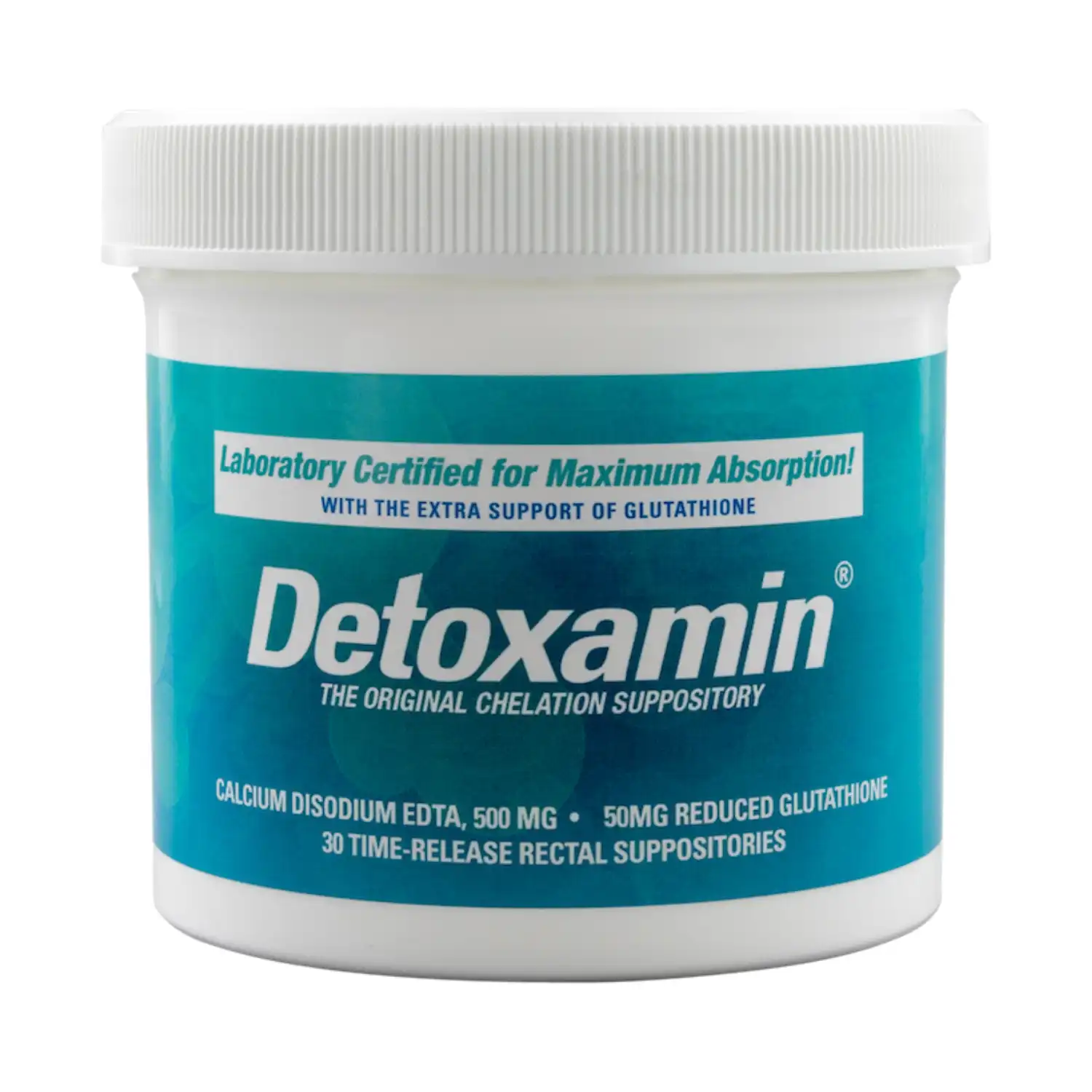 Detoxamin EDTA with Glutathione suppostories are the only EDTA suppository available with available studies. Medically equal results to IV EDTA chelation. Each jar contains 30 (2 month supply) individually sealed Detoxamin® 500MG premium USP grade calcium-disodium EDTA plus 50 mg glutathione suppositories.