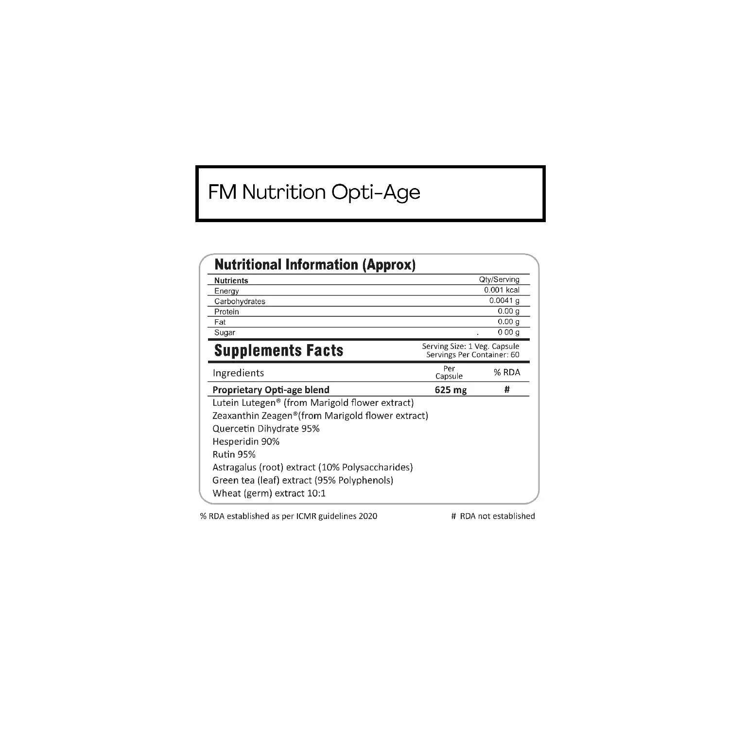 FM Nutrition Opti-Age is an innovative blend of Astragalus, Lutein, Zeaxanthin, quercetin, hesperidin, etc crafted for anti-ageing and mitochondrial health.