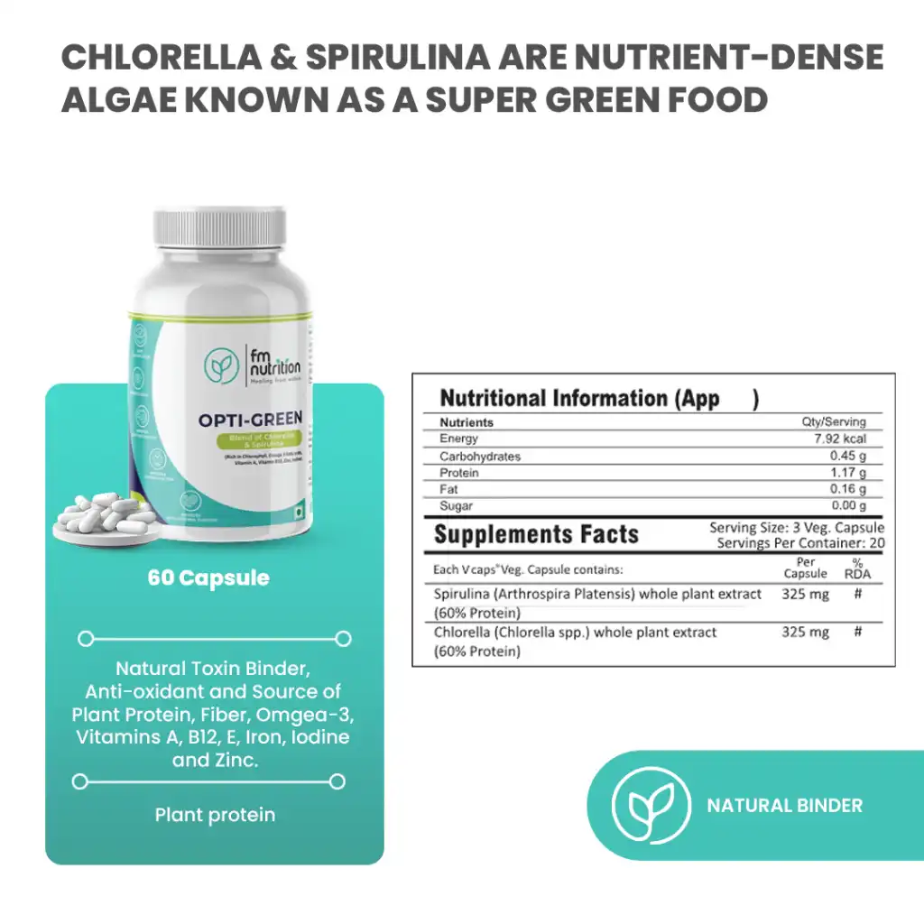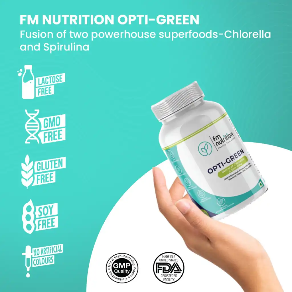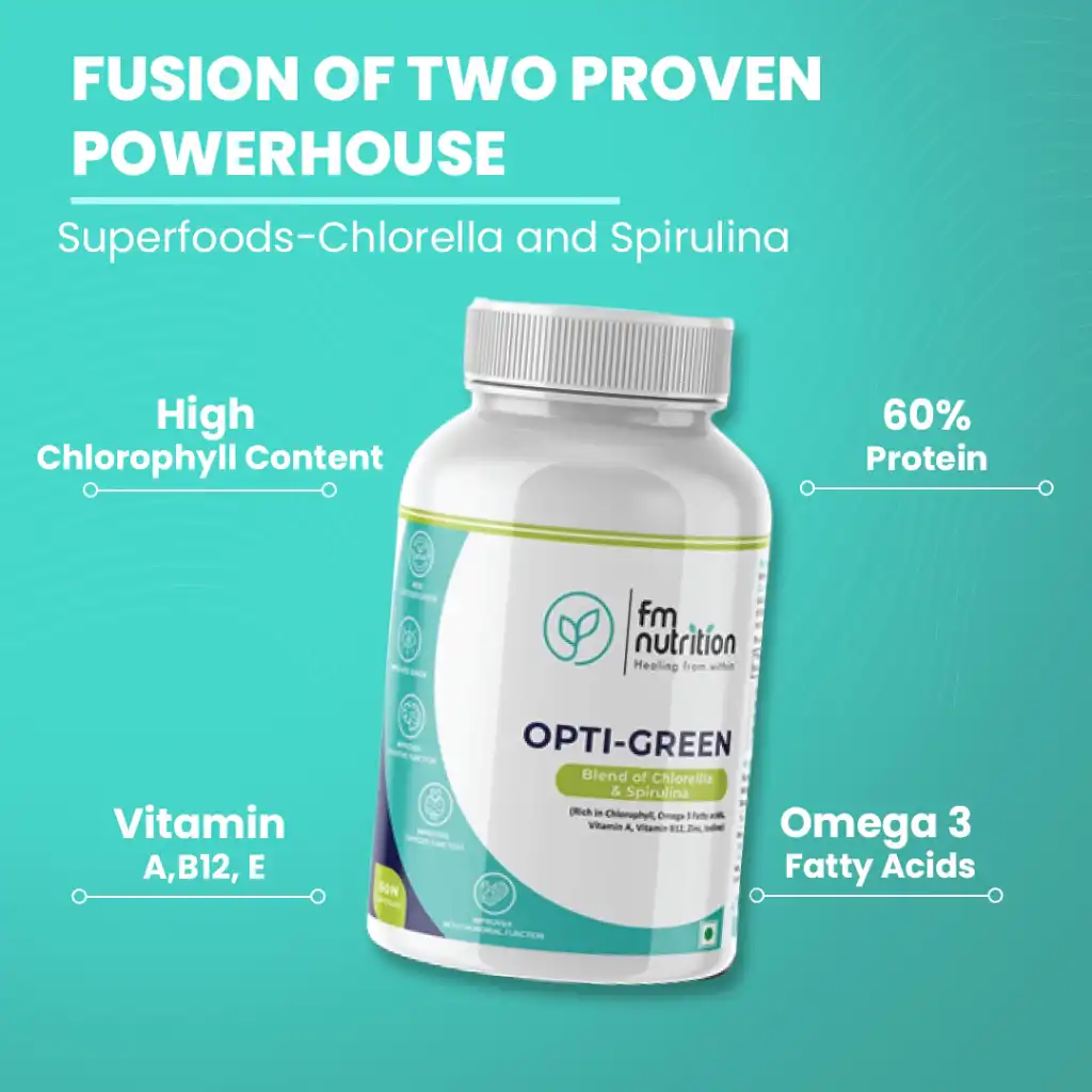FM Nutrition Opti-Green combines Chlorella and Spirulina superfoods, rich in nutrients like chlorophyll, protein, fiber, Omega-3 fatty acids, Vitamin A, Vitamin B12, Vitamin E, Zinc, Iron, and Iodine, providing a wide range of health benefits for your well-being.