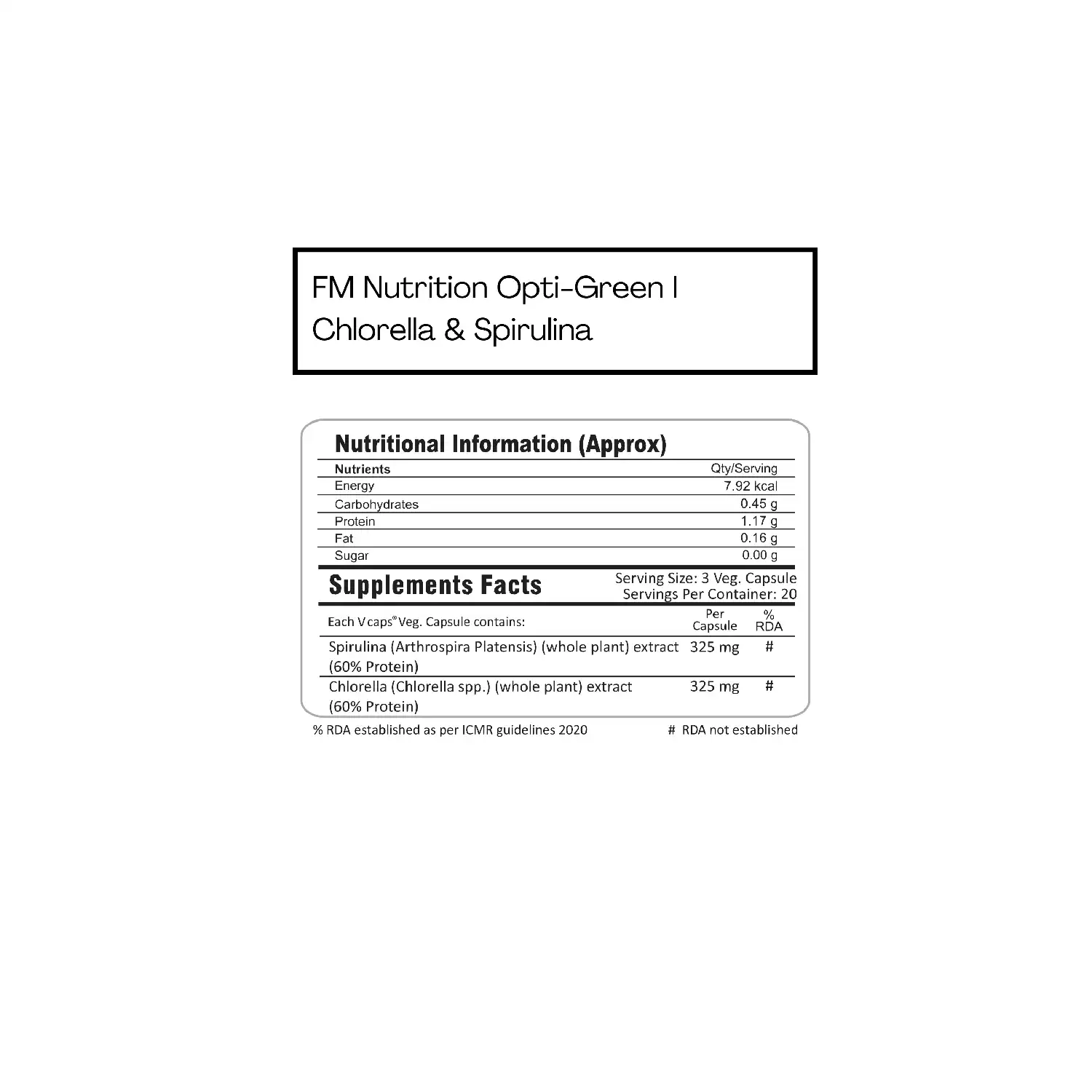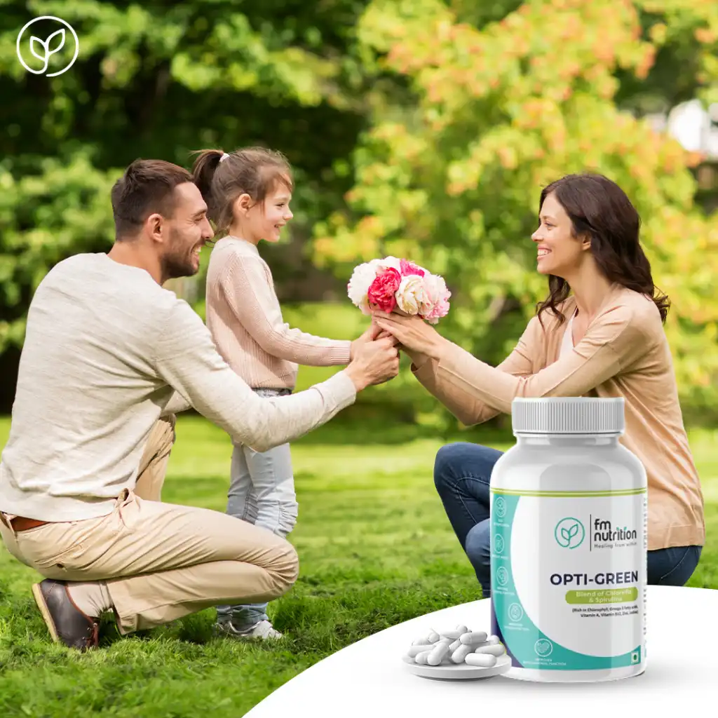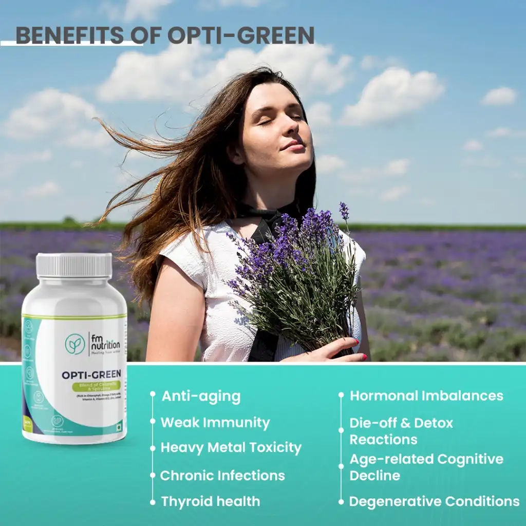 FM Nutrition Opti-Green combines Chlorella and Spirulina superfoods, rich in nutrients like chlorophyll, protein, fiber, Omega-3 fatty acids, Vitamin A, Vitamin B12, Vitamin E, Zinc, Iron, and Iodine, providing a wide range of health benefits for your well-being.