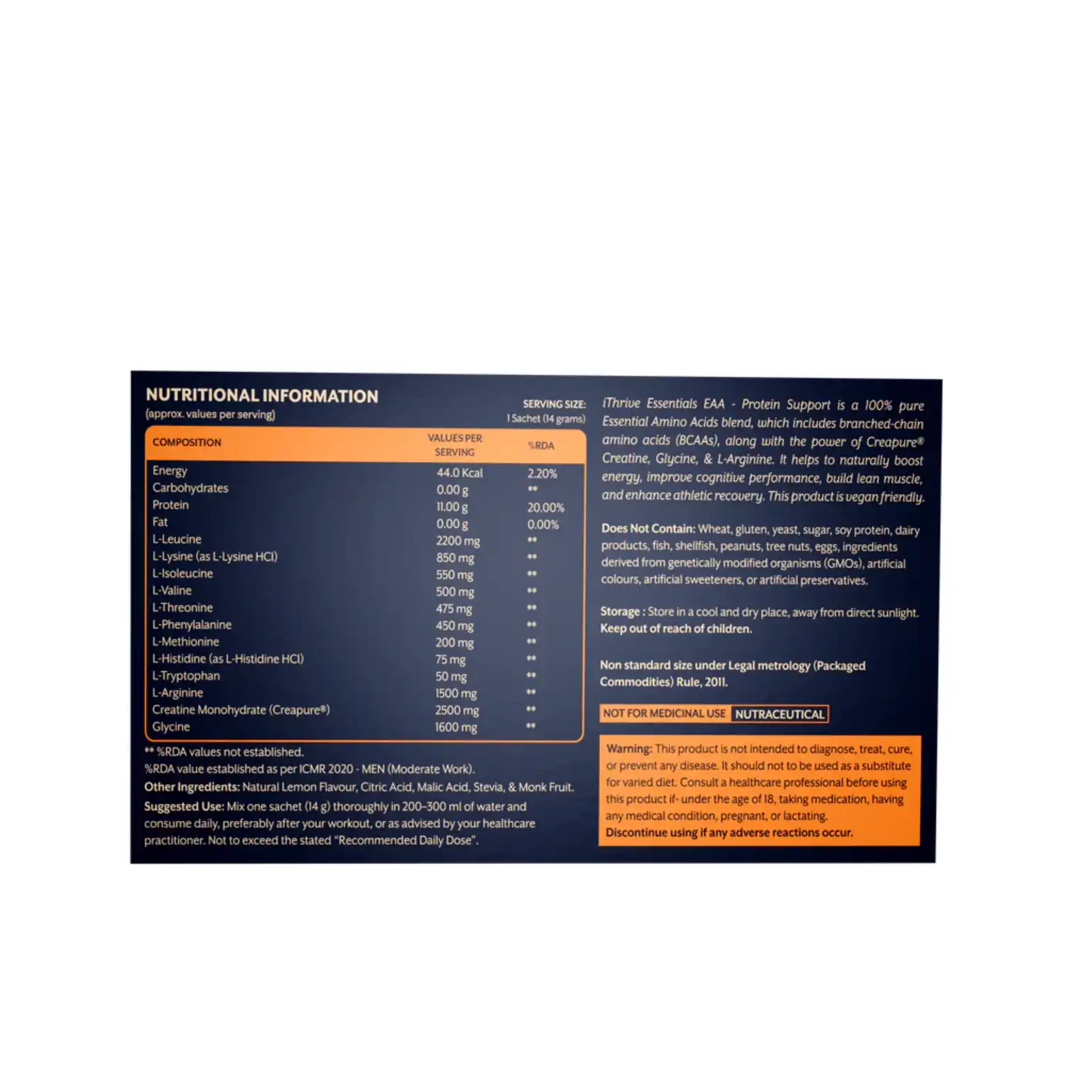 EAA Protein Support is a potent combination of nine essential amino acids including 3 BCAAs, along with glycine, Arginine Alpha-Ketoglutarate (AAKG), and Creatine Monohydrate, that is intended to promote muscle building and boost energy. Perfect for sportsmen, fitness enthusiast, and everybody else looking for the best possible strength, stamina, and energy.