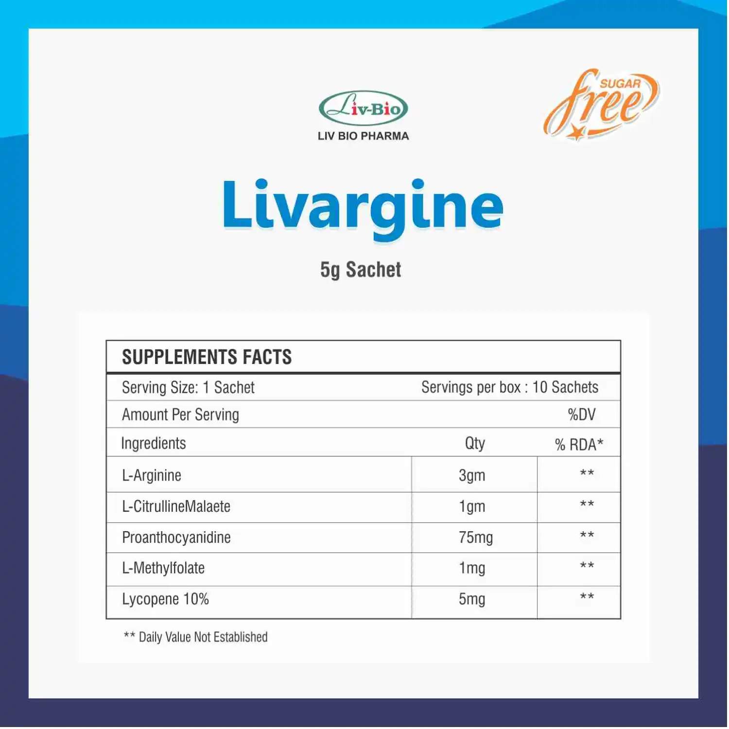 Livbio Livargine is a clinically formulated blend of L-Arginine, L-Citrulline, Proanthocyanidins, Lycopene, and L-Methyl Folate designed to cleanse, dilate, relax, and protect the vascular system. This potent combination enhances nitric oxide production, improves blood flow, supports male sexual health, and provides strong antioxidant and circulatory benefits.