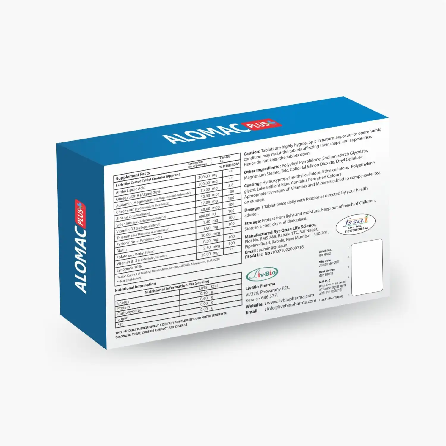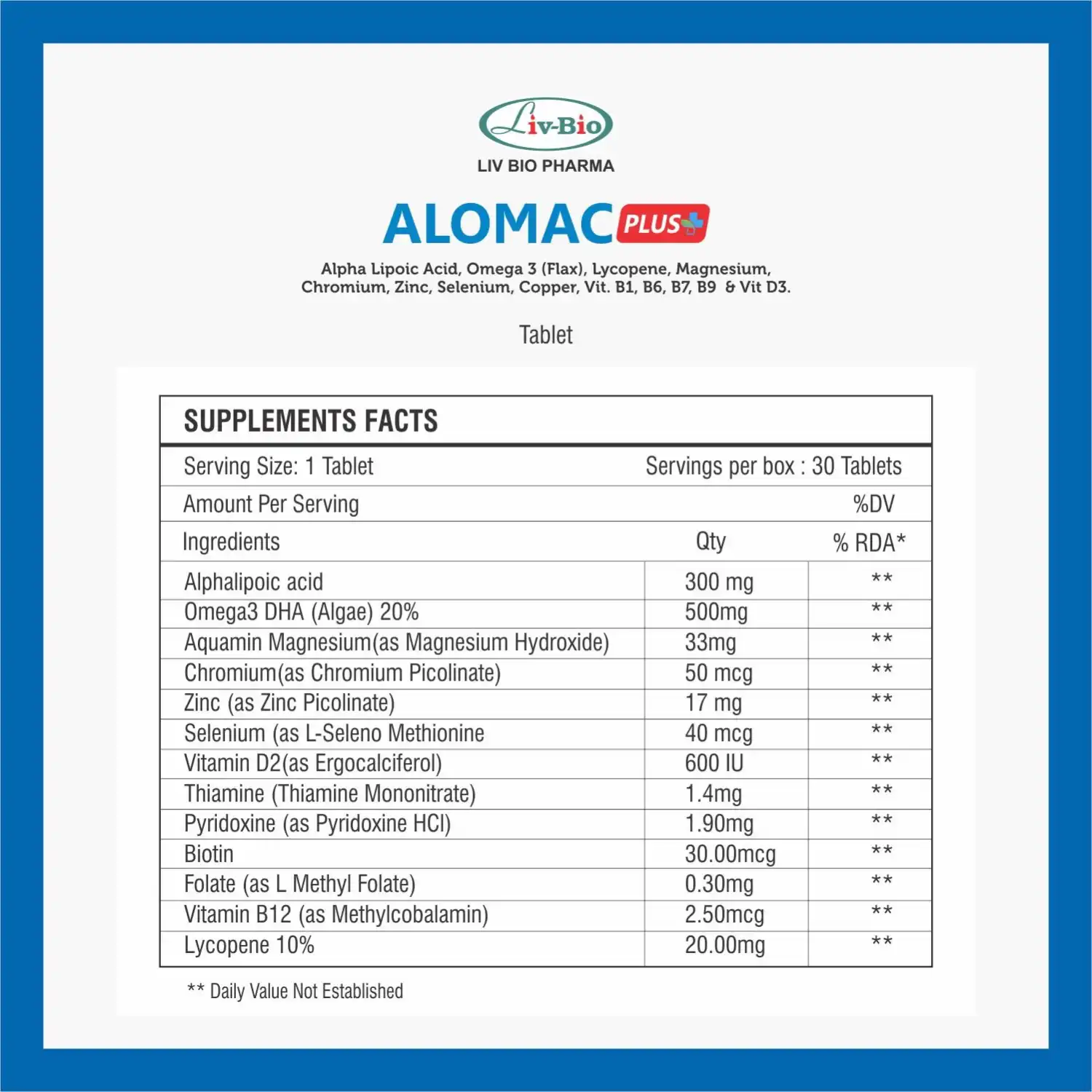 Alomac Plus is a synergistic blend of antioxidants, essential fatty acids, vitamins, and minerals designed to combat oxidative stress, support nerve and cardiovascular function, and promote overall metabolic balance. With potent ingredients like Alpha Lipoic Acid, Omega-3 fatty acids, Chromium Picolinate, Selenium, Zinc, Pyridoxine 5-Phosphate & LMethyl Folate this formula provides complete cellular protection and energy support for modern lifestyles.