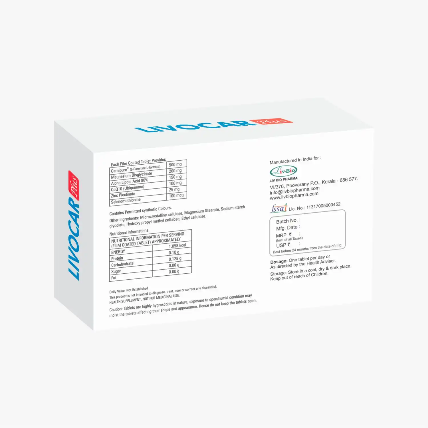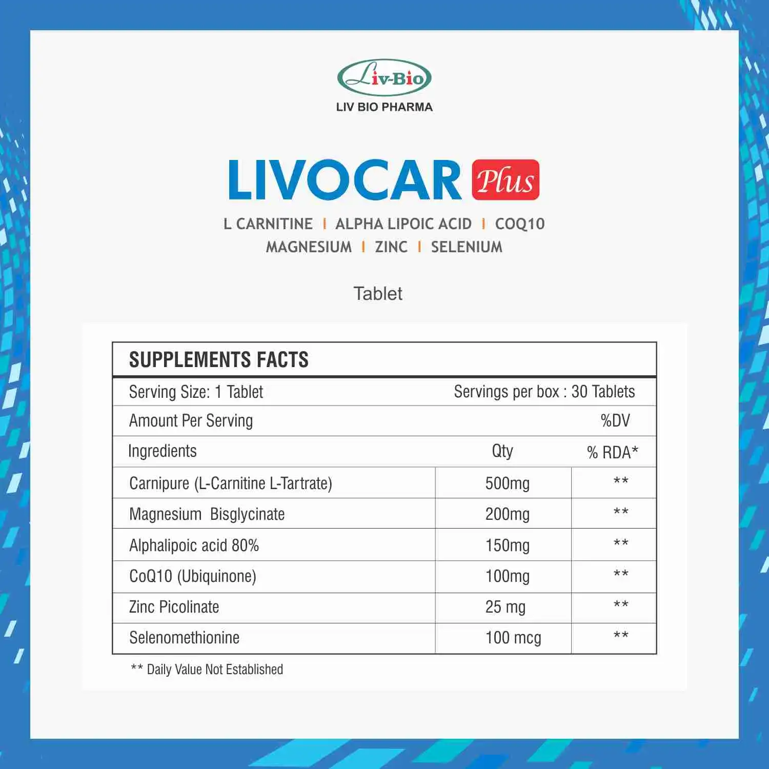 Livocar Plus is a comprehensive cardiovascular and metabolic support formula combining L-Carnitine, Alpha Lipoic Acid, CoQ10, Magnesium, Zinc, and Selenium. Ideal for individuals looking to boost mitochondrial energy, improve cardiac performance, and support antioxidant defense.