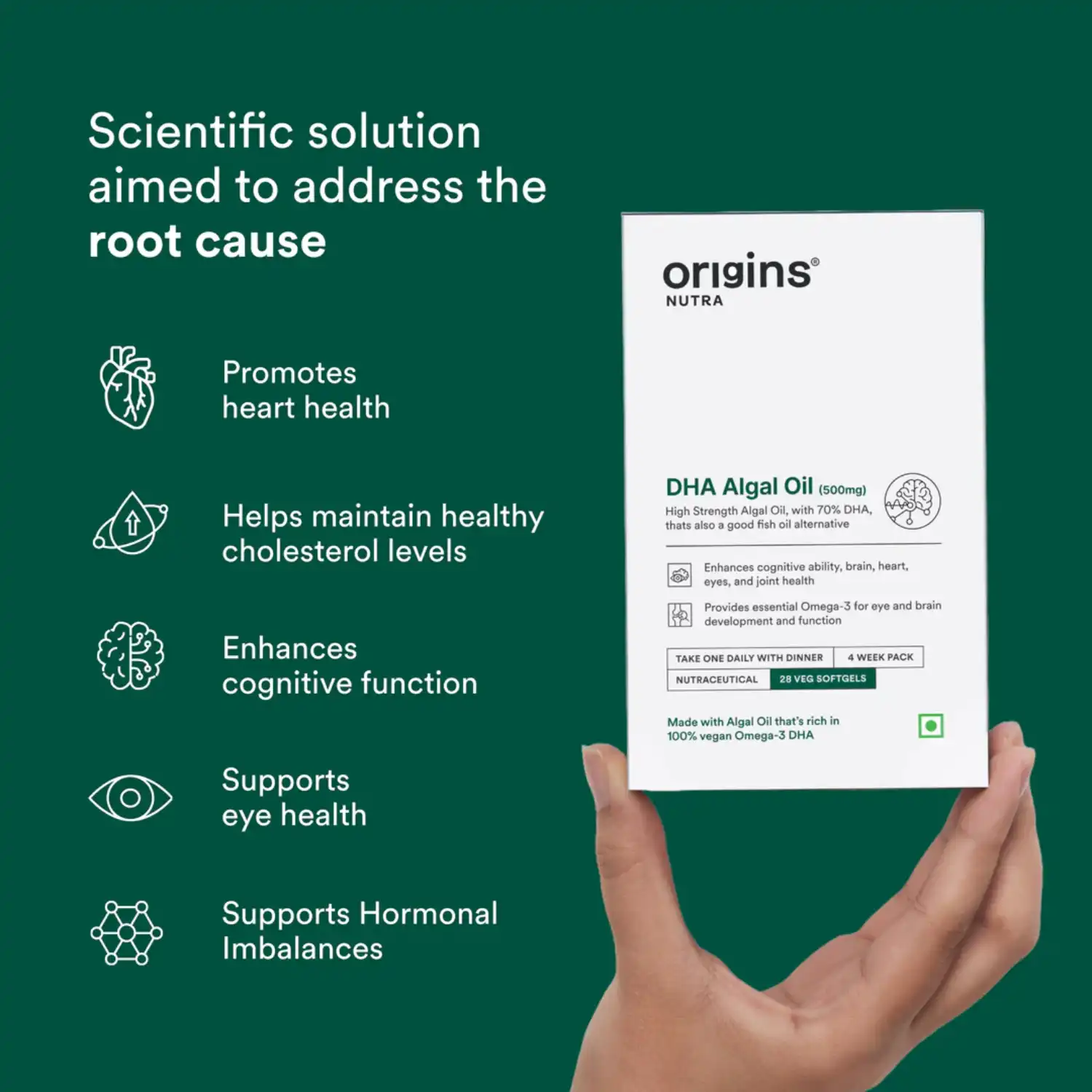 Origins Nutra DHA Algal Oil is a plant-based, high-strength omega-3 supplement that delivers 70% pure DHA derived from microalgae. It is designed to support essential brain, heart, joint and eye health for overall wellness. It’s a perfect vegan alternative to fish oil.