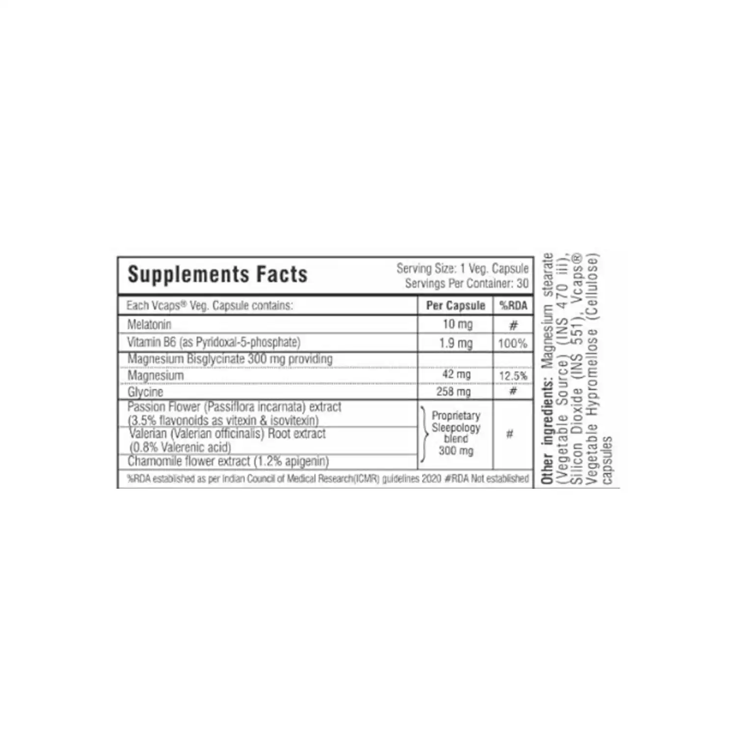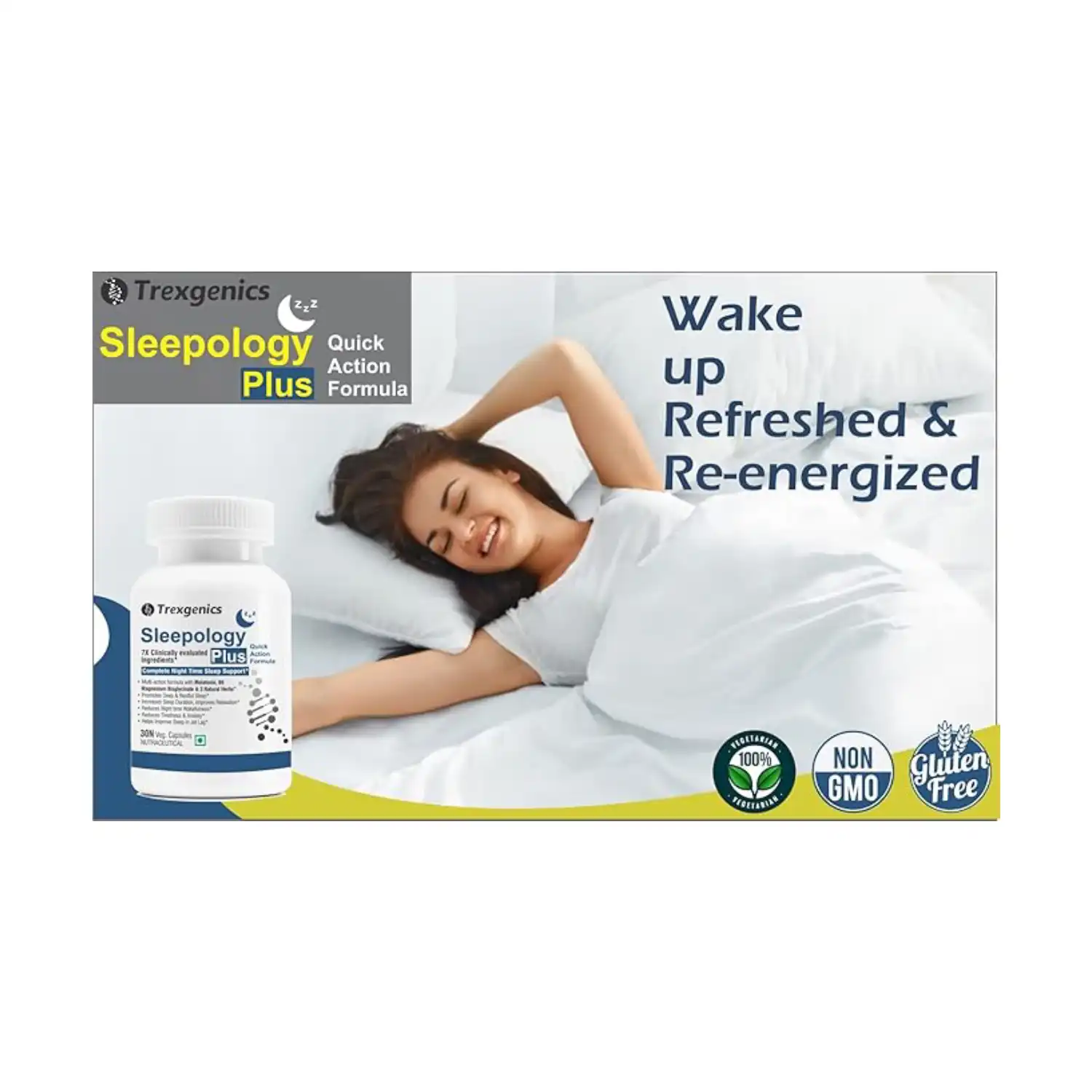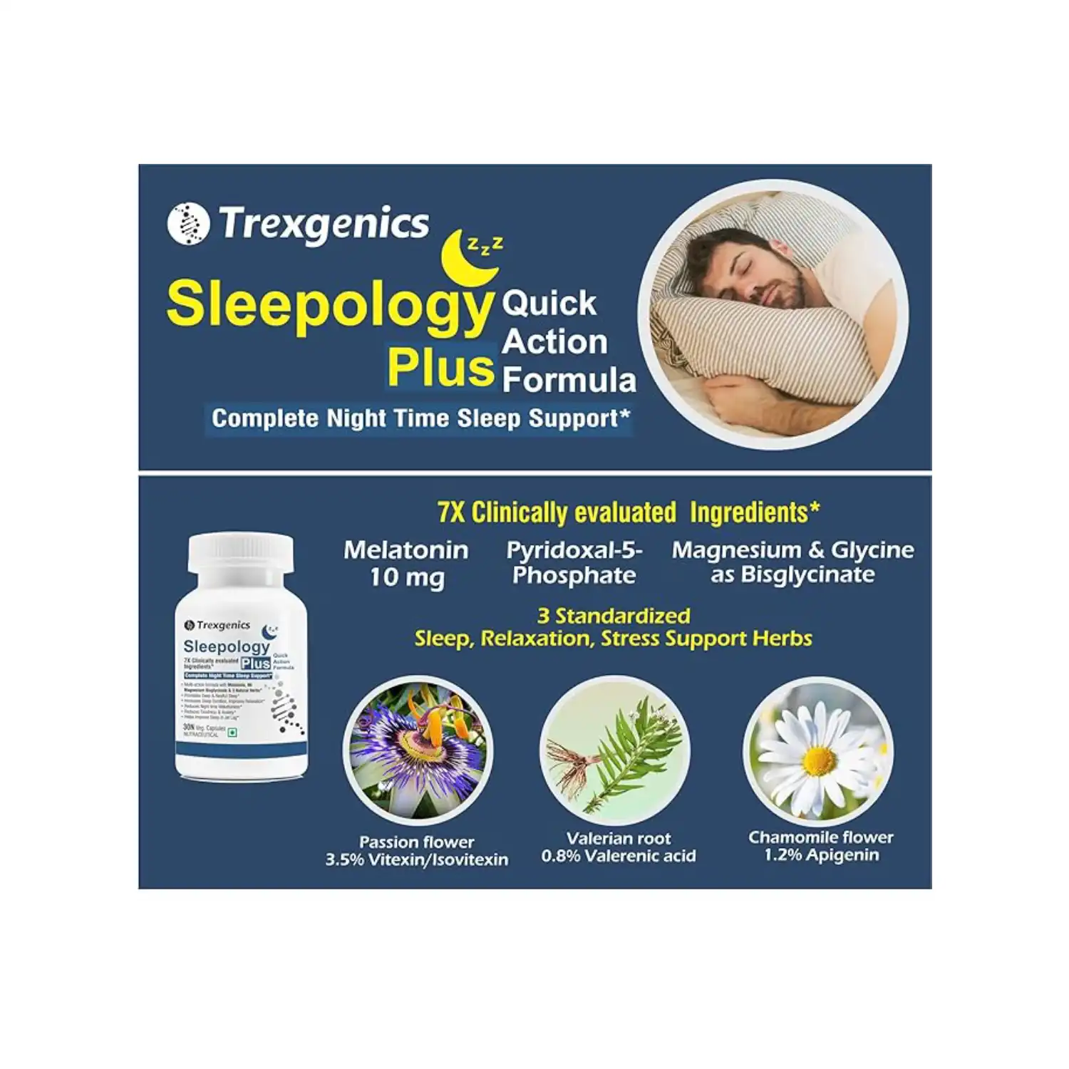 Trexgenics Sleepology Plus is a powerful sleep aid capsule designed to enhance sleep quality and duration. Formulated with Melatonin, P5P (Vitamin B6), Magnesium Bisglycinate, Valerian, Passion Flower, and Chamomile, it promotes deep, restful sleep, reduces anxiety and stress, and supports relaxation.