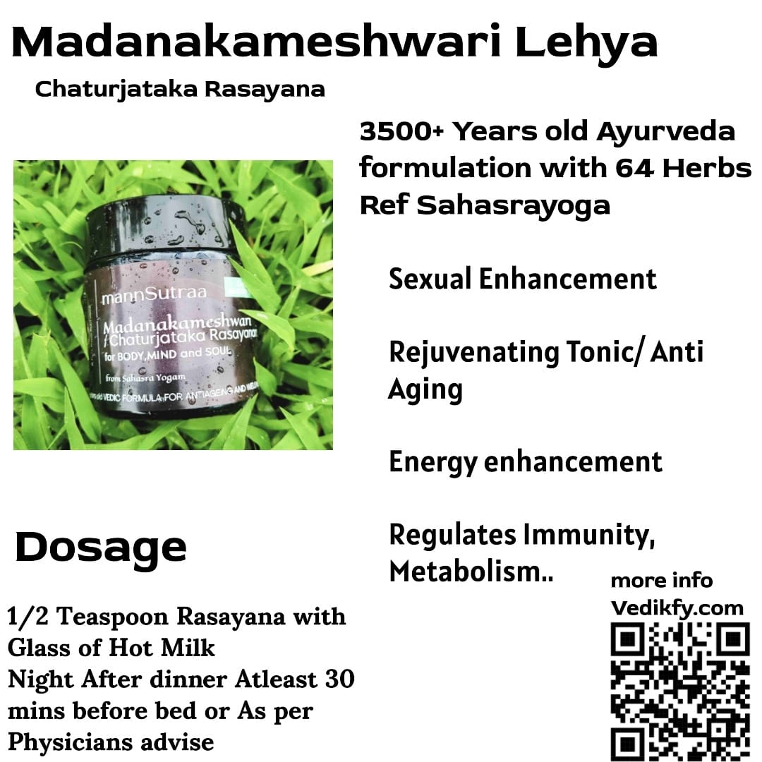 Madanakameshwari Rasayana, also known as Chaturajata Rasayana, is a classical Ayurvedic formulation mentioned in the revered Sahasrayoga text, a compilation of 1000 formulations by traditional physicians from Southern India. Believed to have been documented in 1192 AD, this powerful Rasayana contains 64 time-tested ingredients. It is celebrated for its rejuvenating, nourishing, and aphrodisiac properties, supporting overall vitality, longevity, and well-being.