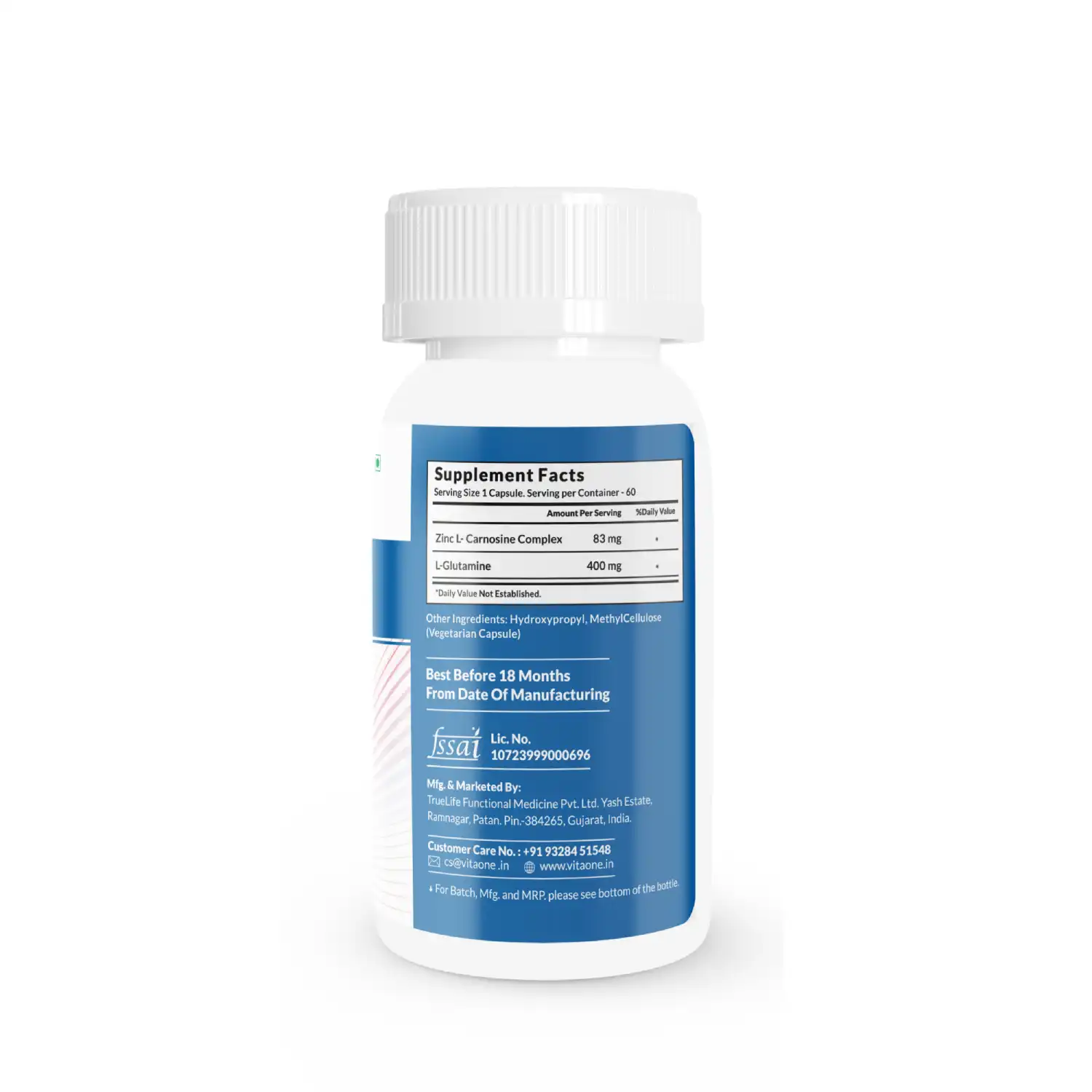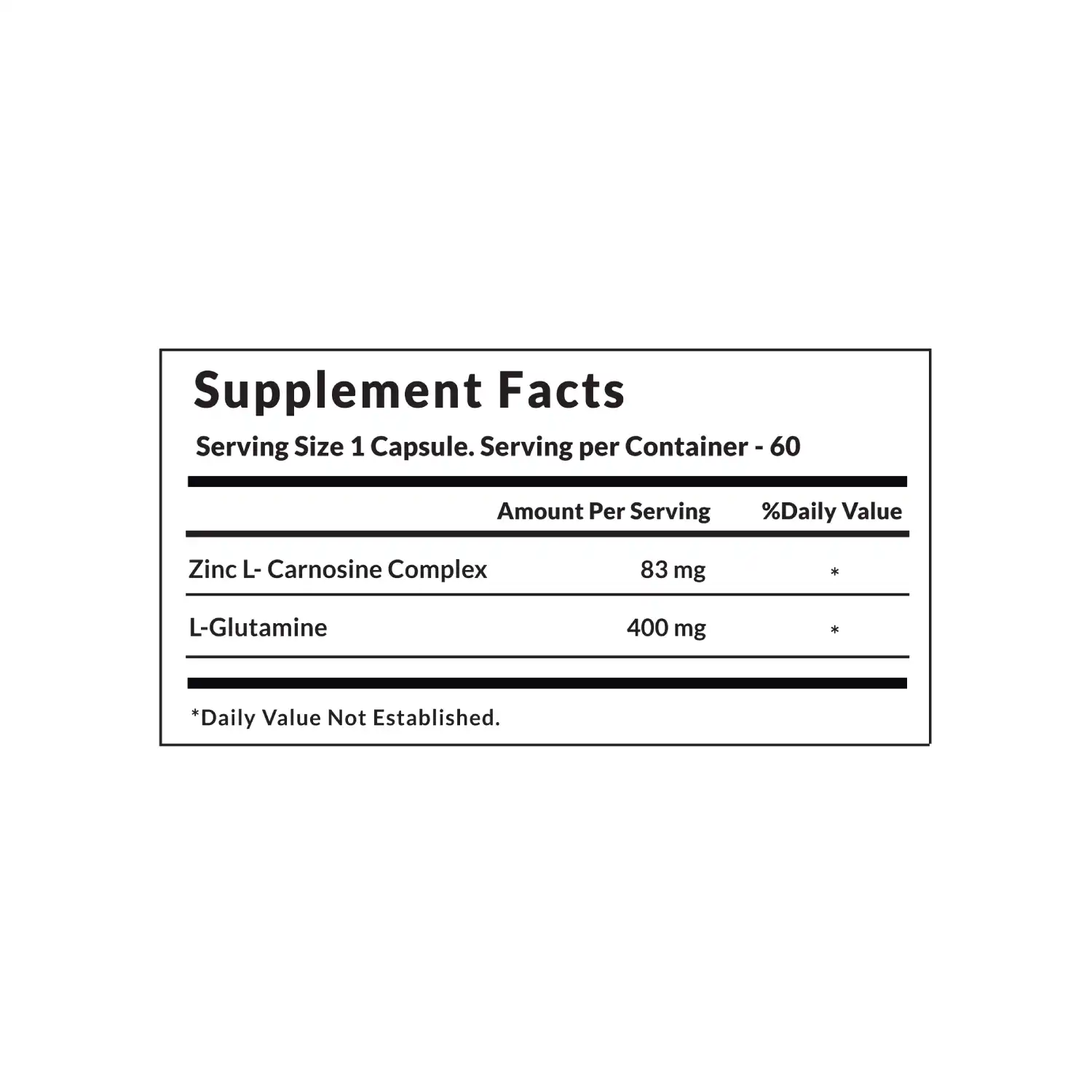 - Zinc L-Carnosine Complex: A chelated compound combining zinc and carnosine to deliver targeted healing to the gut lining. Shown to support mucosal repair and reduce gastric irritation.
