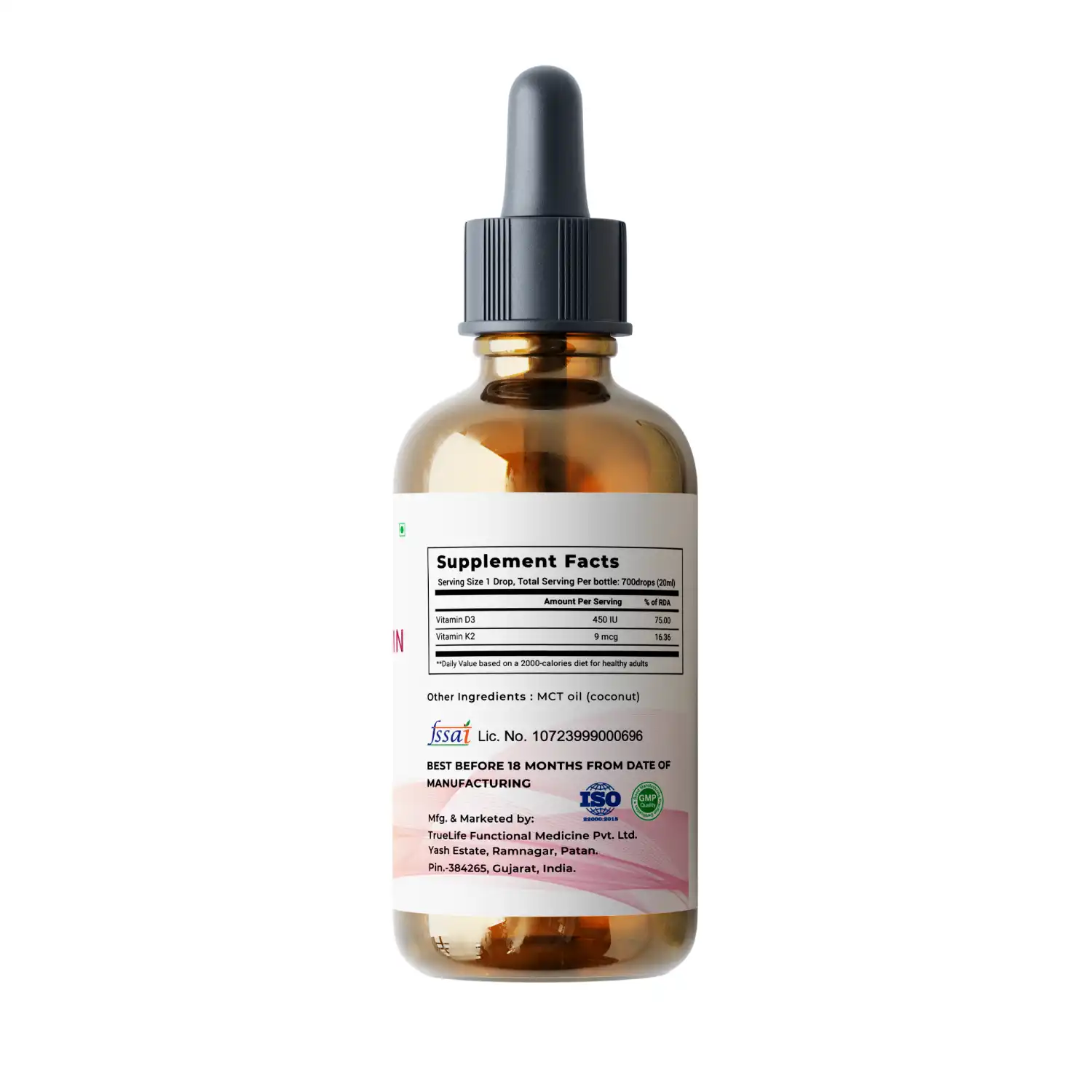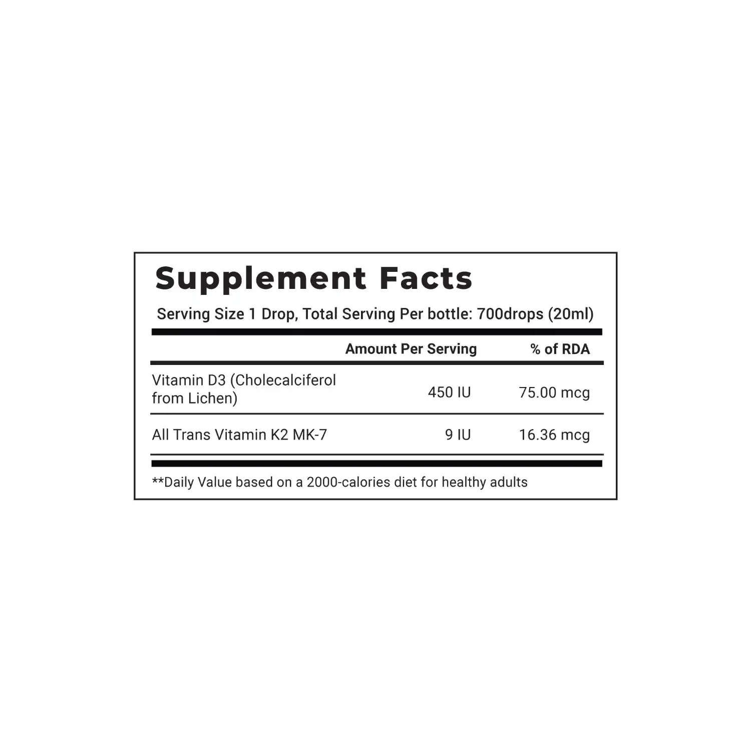 VitaOne’s Daily Liquid Vitamin D3+K2 is a professional-grade formula featuring highly bioavailable Vitamin D3 (cholecalciferol) derived from lichen and Vitamin K2 (MK-7, menaquinone-7). Enhanced with MCT oil for optimal absorption. Each drop delivers 450 IU of Vitamin D3, allowing you to customize your daily intake.