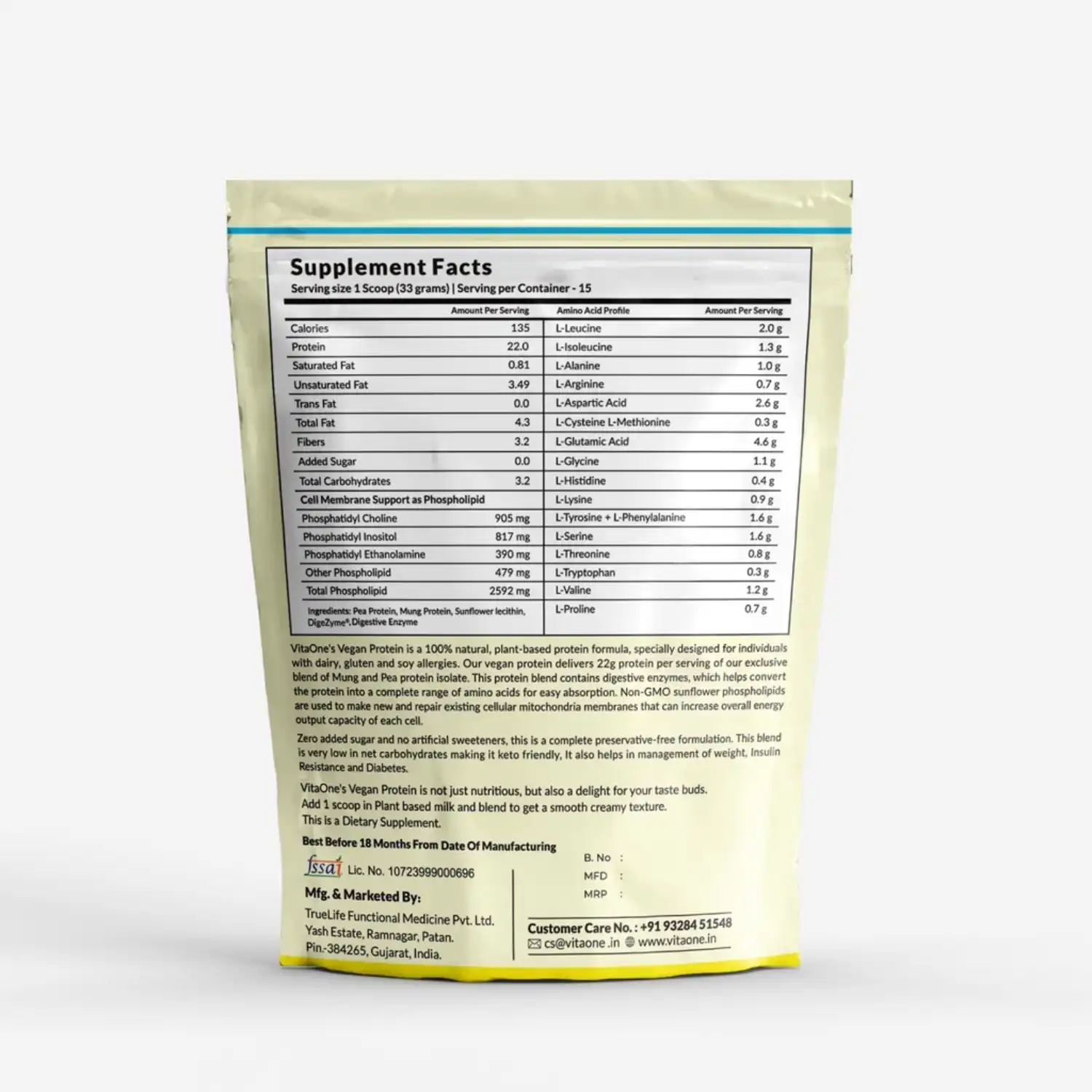 VitaOne combines a superior protein source (mung + pea), phospholipids for cell health, and enzymes for better digestion, making it more than just a protein supplement.