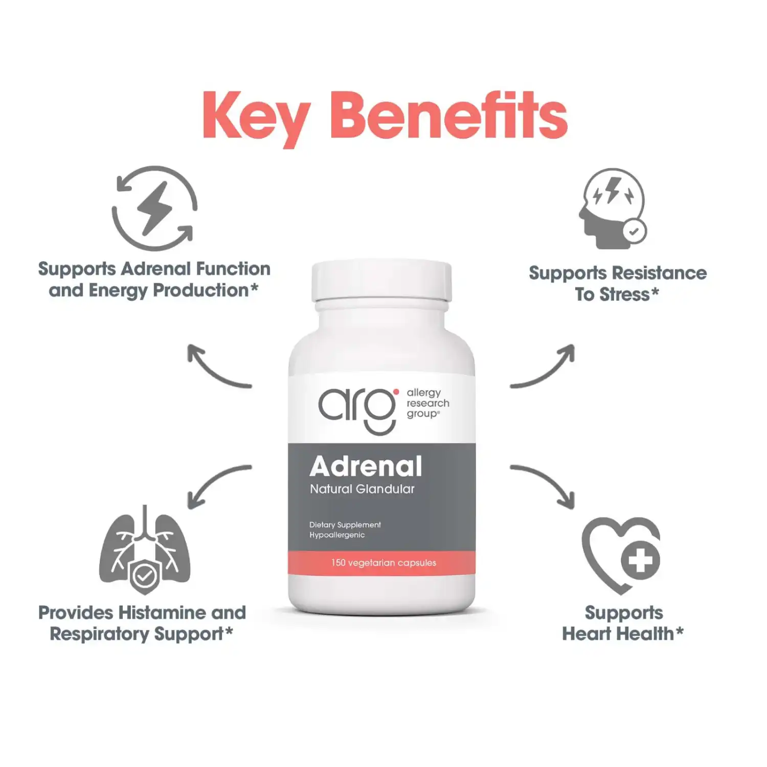 Allergy Research Group Adrenal Natural Glandular is a natural glandular supplement designed to support healthy adrenal function and the body’s ability to adapt to stress. It contains freeze-dried adrenal tissue, including both the cortex and medulla. This helps preserve important nutrients and bioactive compounds that nourish adrenal activity, energy metabolism, immune defense, and overall stress resilience.