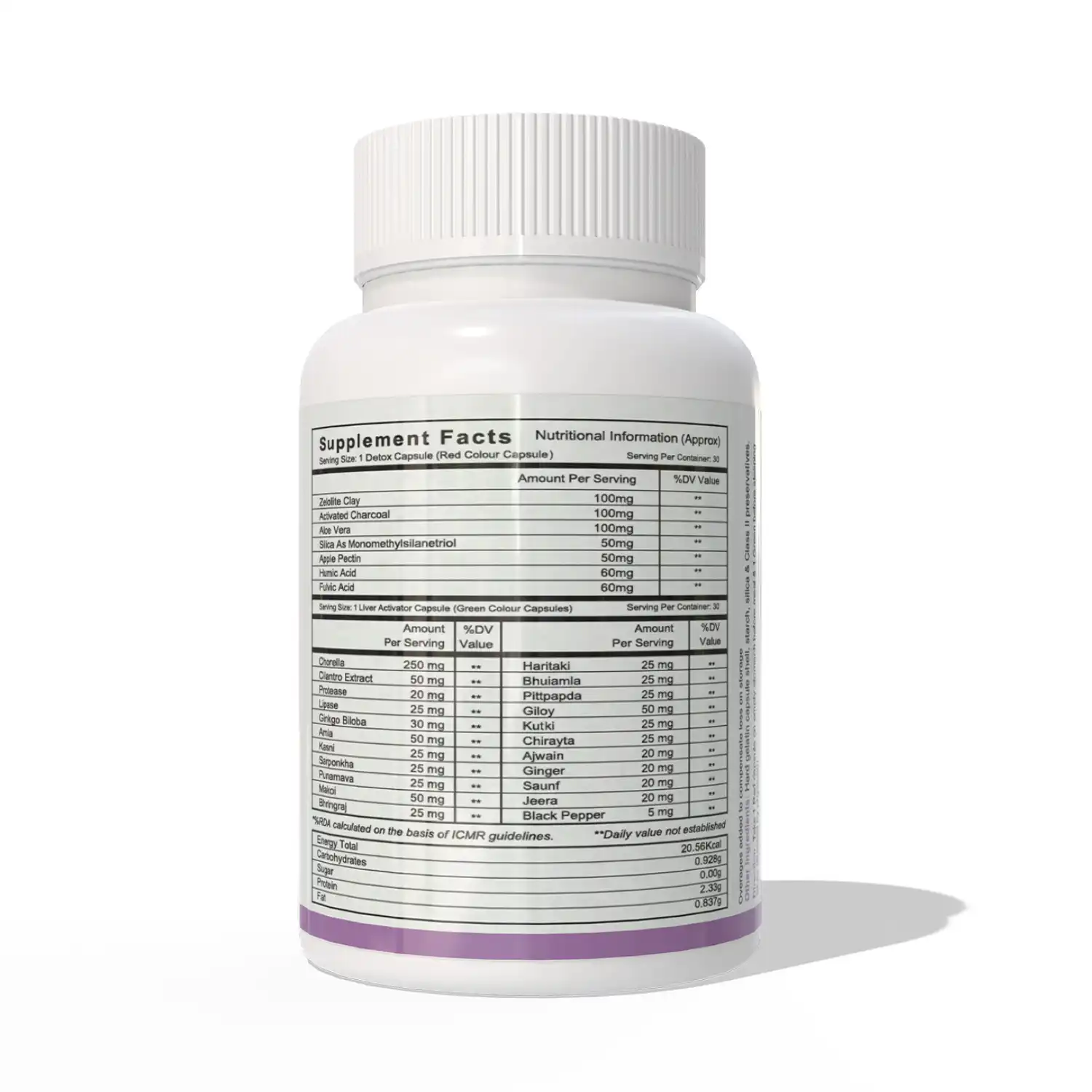 - 22 Herbs (chlorella, cilantro, amla, ajwain, saunf, black pepper, etc): These herbs stimulate the liver for safe detoxification.