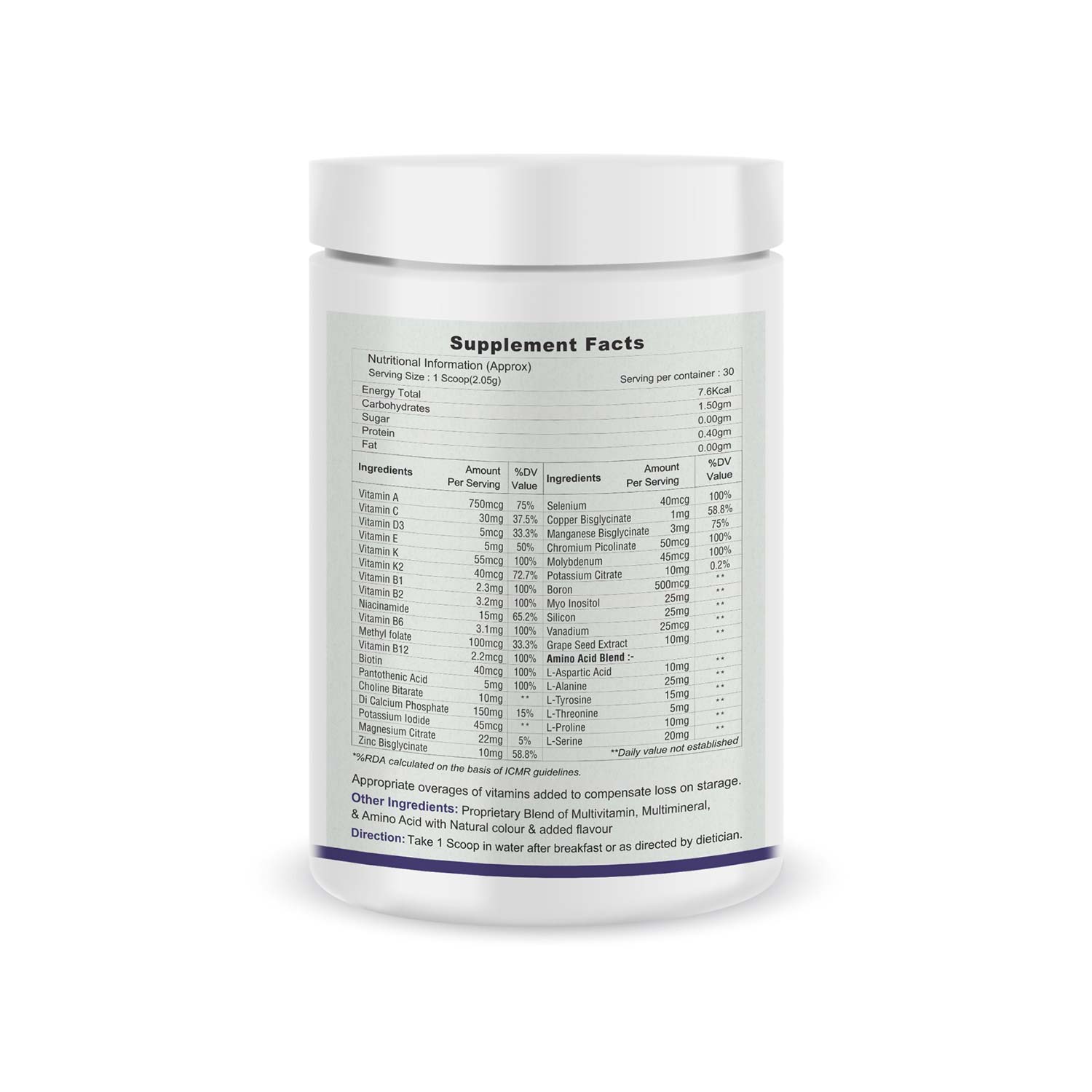 Comprehensive blend of A, D, E, K, B-complex, C vitamins, multiminerals, micronutrients, trace elements, Grape Seed, and Amino Acid Blend—all in one.