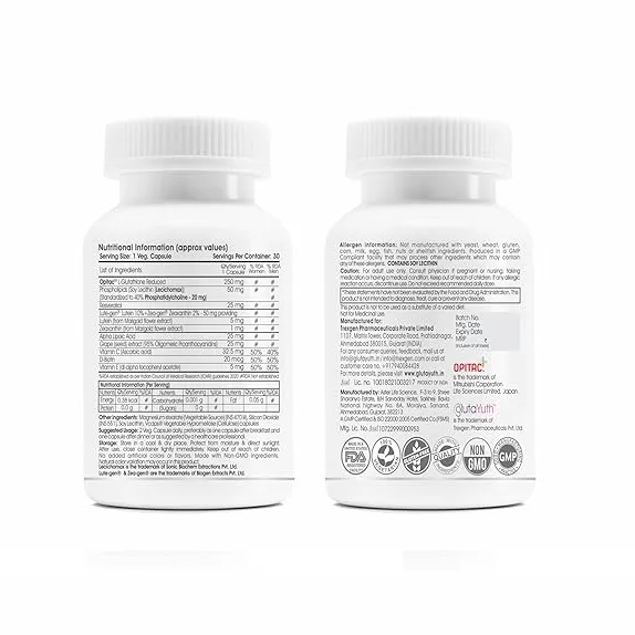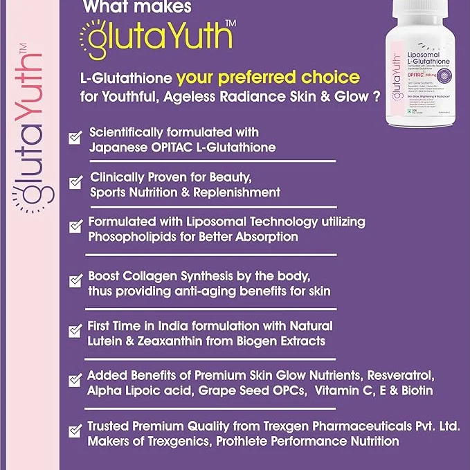 GlutaYuth Liposomal L-Glutathione 250mg Complex with Phosphatidylcholine is an innovative blend designed to enhance your skin’s radiance and vitality. Crafted with care, this advanced Glutathione complex combines the power of Japanese Optitac L-Glutathione with a fusion of skin-nourishing nutrients including Lutein, Zeaxanthin, Resveratrol, Alpha Lipoic Acid, Grape Seed Extract, Vitamin C, E, and Biotin.