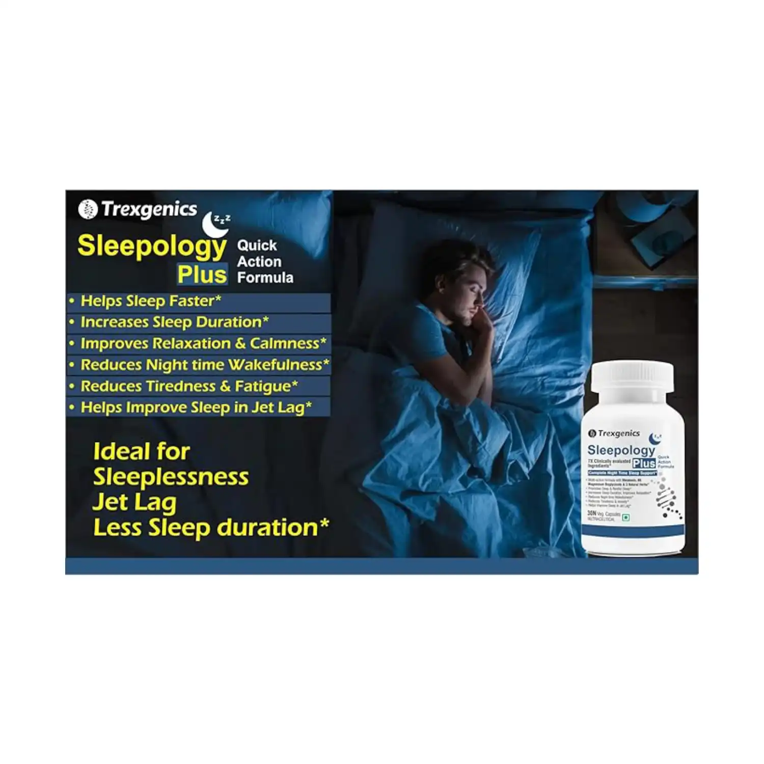 Trexgenics Sleepology Plus is a powerful sleep aid capsule designed to enhance sleep quality and duration. Formulated with Melatonin, P5P (Vitamin B6), Magnesium Bisglycinate, Valerian, Passion Flower, and Chamomile, it promotes deep, restful sleep, reduces anxiety and stress, and supports relaxation.
