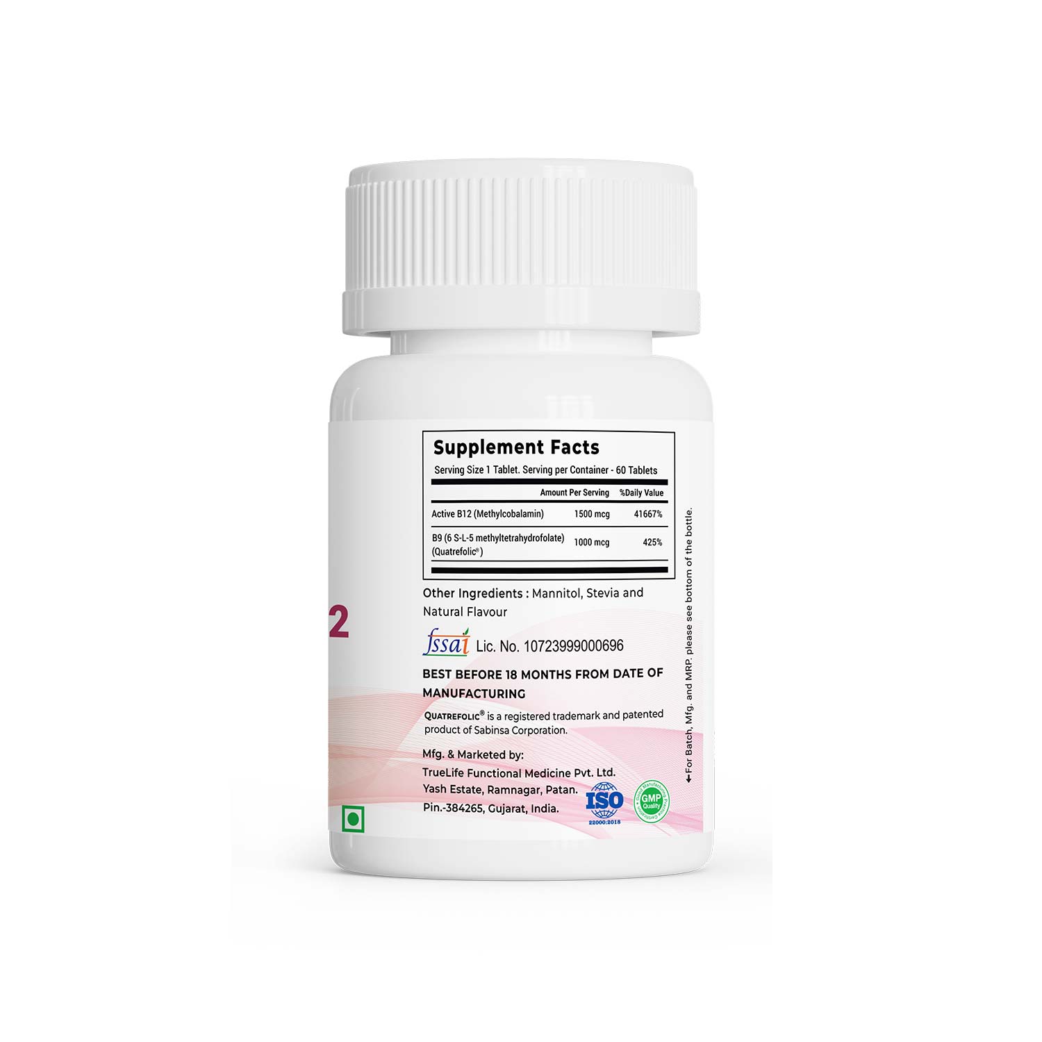 - Active B12 (Methylcobalamin): Bioactive type of B12 that supports red blood cell production, energy metabolism, and brain function. Facilitates the methylation of homocysteine into methionine, promoting heart and cognitive health.