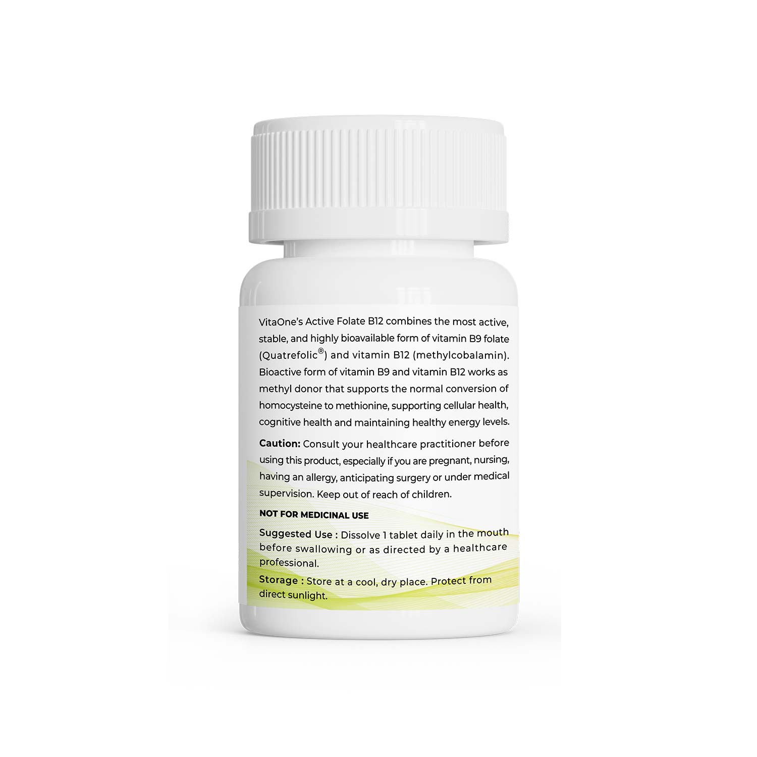 VitaOne’s Active Folate B12 combines the most active, stable, and highly bioavailable form of Vitamin B9 folate (Quatrefolic® brand) and Vitamin B12 (Methyl Cobalamin).