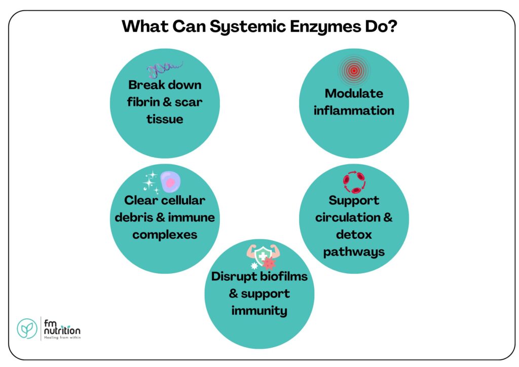 These are systemic enzymes—and in Functional Medicine, we use them as powerful tools for modulating inflammation, enhancing recovery, and clearing out cellular debris that can build up in the body over time.