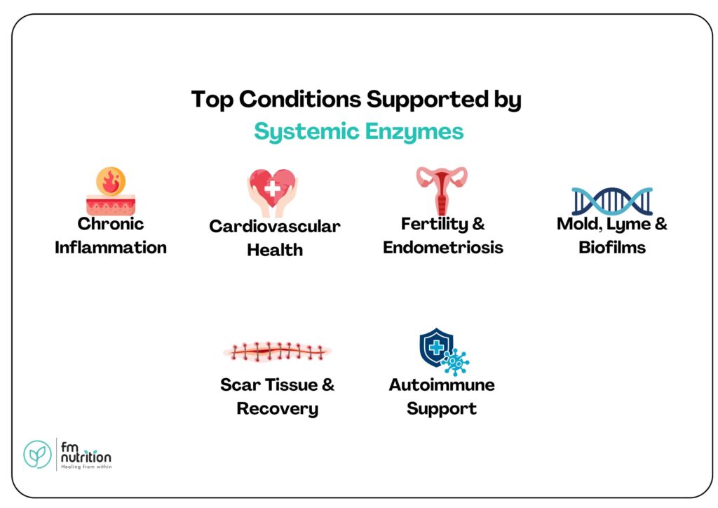 These enzymes help break down fibrin, inflammatory proteins, scar tissue, biofilms, and immune complexes that can linger in the body and contribute to chronic issues.